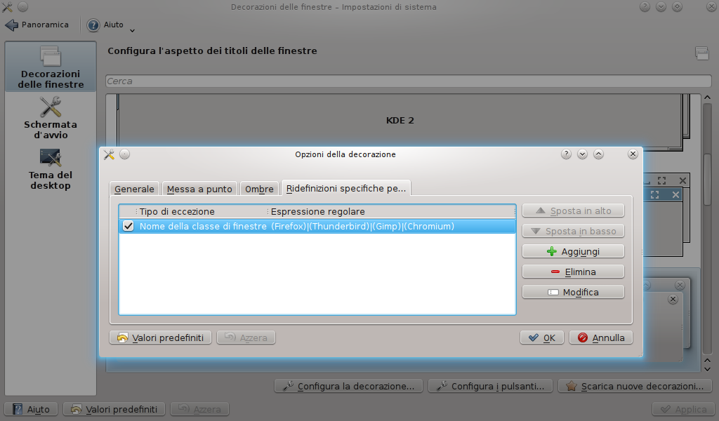 Ora andate a Impostazioni di Sistema -> Aspetto dello spazio di lavoro ed entrate in configura la decorazione. Andate all'ultima scheda e aggiungete |(Chromium) alle eccezioni, come nella foto