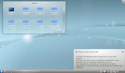 Beh, devo dire che non me l'aspettavo cosi fluido. Kwin è un gestore di effetti geniali, all'inizio molti effetti - inutili per il netbook - erano impostati di default, il che rendeva tutto un po' lento, ma dopo un po' di secondi mi è successo questo:Insomma, anziché andare in crash, Kwin rileva un blocco e ti dice "guarda te li ho disattivati perché il pc era lento". Geniale, cosa che Compiz non avrebbe, o per lo meno a me, non ha mai fatto. Sono andato ad impostazioni di sistema -> effetti desktop e ho disabilitato quasi tutto tranne ingrandimento, e altri due effetti.