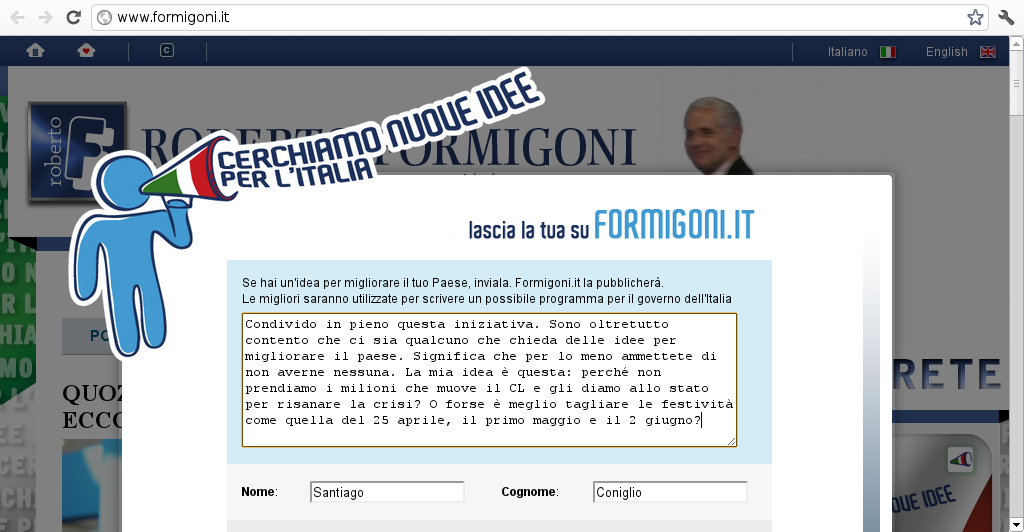 E Formigoni, sto tizio che dalla DC è passato a Forza Italia, che quando Berlusconi era coinvolto nel caso delle escort lui chiese esplicitamente ai credenti che lo seguono, aka "cattolici italiani in cerca di buon senso", di fare una sospensione di ogni giudizio morale nei confronti del premier, questo grandissimo genio, che se l'avesse visto mio nonno ai tempi della guerra non avrebbe esitato a sparargli un colpo col suo fucile nel bel mezzo del buco del culo, ora viene visto come "la persona che veramente potrebbe unire l'italia e promuoverla in tutti i sensi possibili ed immaginabili di questa politica che non è più politica." (video) Sì, lui, con quella faccia. E quei volontari dei miei coglioni portano perfino la maglia con l'indirizzo www.formigoni.it.