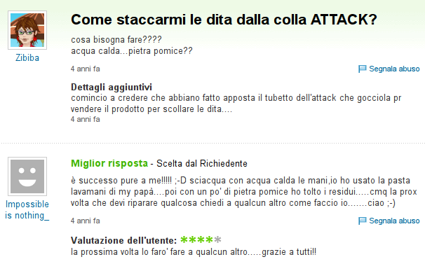 - Yahoo Answers: Come staccarmi le dita dalla colla Attack?