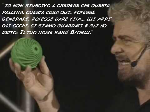 Tuttavia, Byoblu crebbe in fretta imparando le tecniche del suo maestro, e aprì un Vlog, o “Video Blog”, vincendo parecchi premi e diventando “famoso”. Finì per essere un “blogger” che vive solo di donazioni e frequenta trasmissioni televisive. Le donazioni servono affinché Byoblu possa fare la sua controinformazione disinteressata, libera, ma sopratutto indipendente. Perché dal giorno in cui è uscito dalla sua prigione-pallina verde, Byoblu è libero.