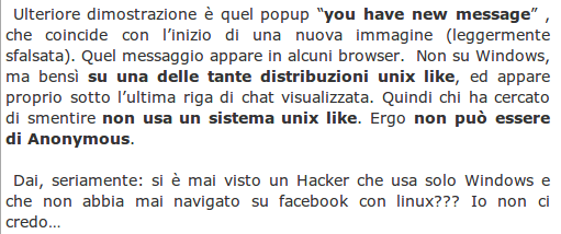Tuttavia, la cosa interessante è che solo una mente impreparata può credere che le parole pubblicate da Byoblu provengano dal collettivo Anonymous Italia, che non agisce inviando comunicati tramite email perché li pubblichino altri bloggers, e non lavora pubblicando dei leaks: