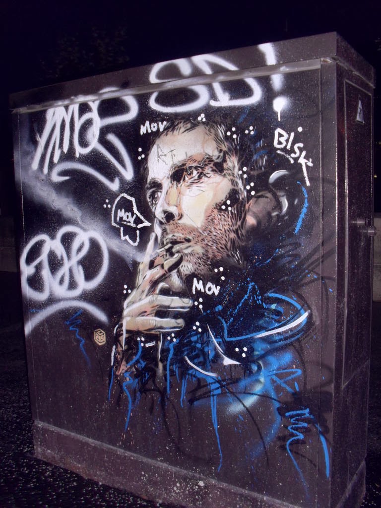Siamo usciti dalla Tour quando era ormai buio. La prima cosa che abbiamo fatto è stata andare in bagno, la seconda prenderci una birra. Vi lascio con qualche foto della strada, un pezzo di Alexandre Farto e uno di C215 che abbiamo trovati nei paraggi tornando all'albergo.