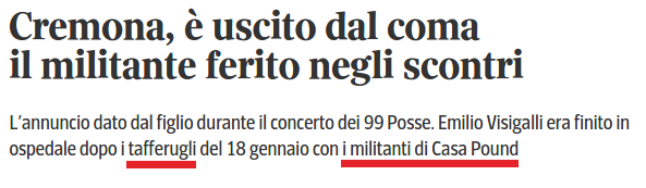 — Wu Ming Foundation (@Wu_Ming_Foundt) January 20, 2015Un altro esempio, il Corriere usa la parola "tafferugli" per una aggressione di cinquanta contro uno in cui quest'ultimo finisce in coma e "militanti" di Casa Pound contrapposti ai militanti antifascisti: capite? è stato solo uno scontro tra di loro (su questo articolo non compaiono le parole "fascismo/isti" né "estremisti"; verso la fine però c'è una condanna di Confcommercio alle "spranghe e alle violenze subite dalla città", quindi dai militanti antifascisti):